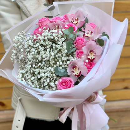 Букет из роз и орхидей с добавлением гипсофилы